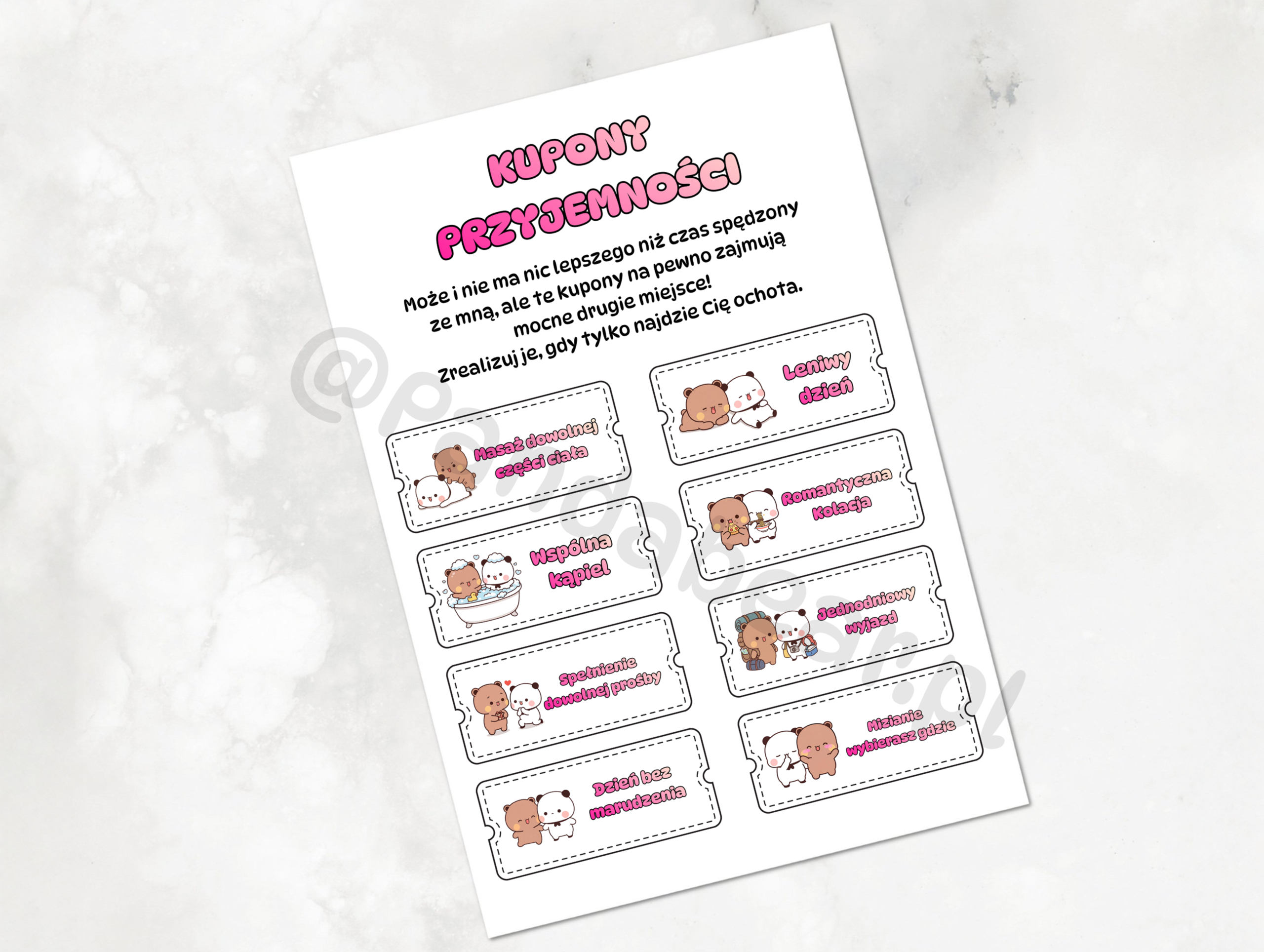 Na arkuszu znajdziesz aż 8 starannie zaprojektowanych kuponów, które urozmaicą każdy związek: od romantycznej kolacji i masażu, aż po legendarny „dzień bez marudzenia”. Każdy kupon ozdobiony jest inną, uroczą grafiką Bubu i Dudu.