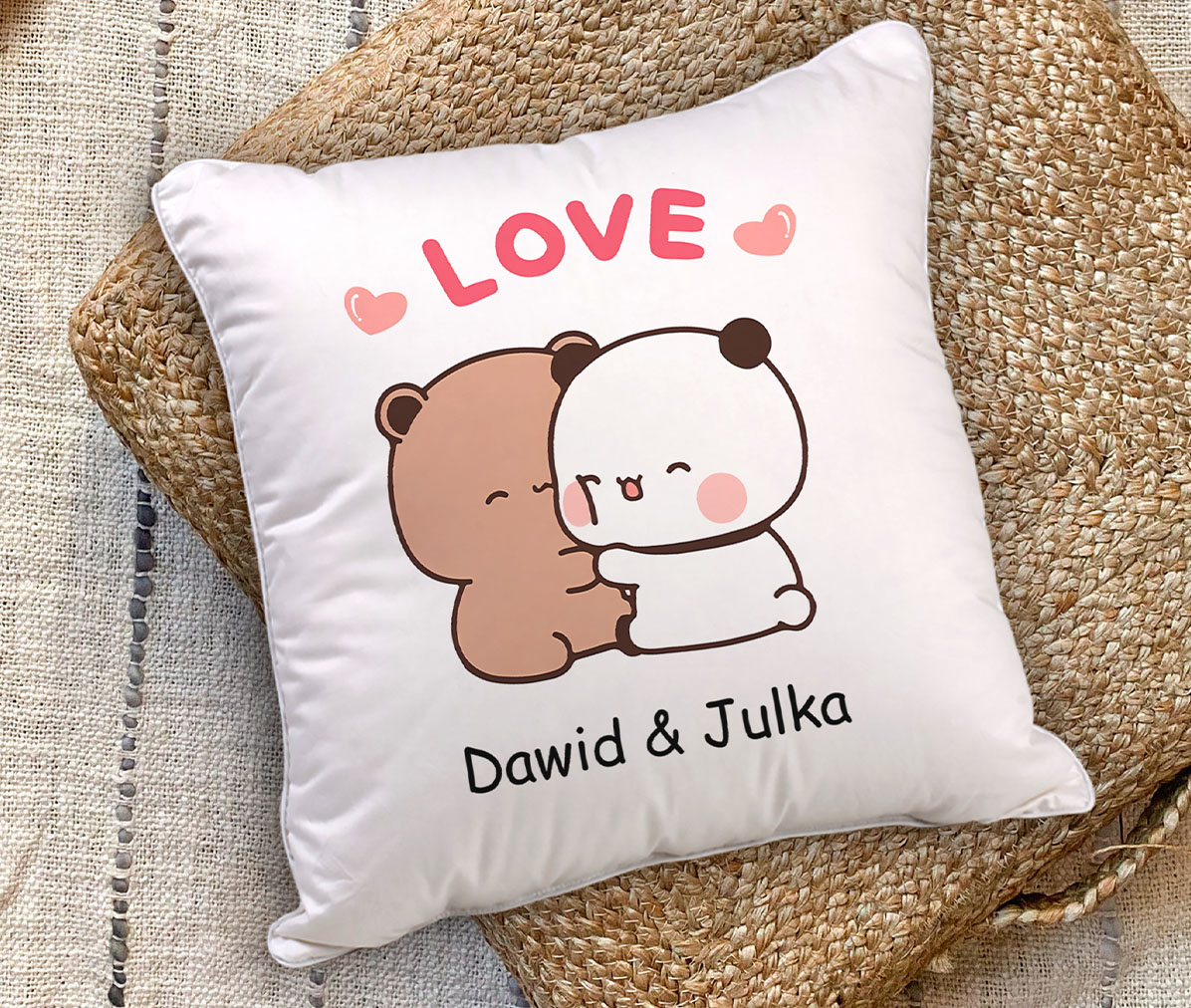 🛏️ Personalizowana Poduszka Bubu Dudu – miękka, przyjemna w dotyku mikrofibra (40×40 cm), w komplecie z poszewką. Możliwość personalizacji imion oraz wzoru sprawia, że staje się wyjątkowym prezentem, który ozdobi każde wnętrze i umili chwile relaksu.